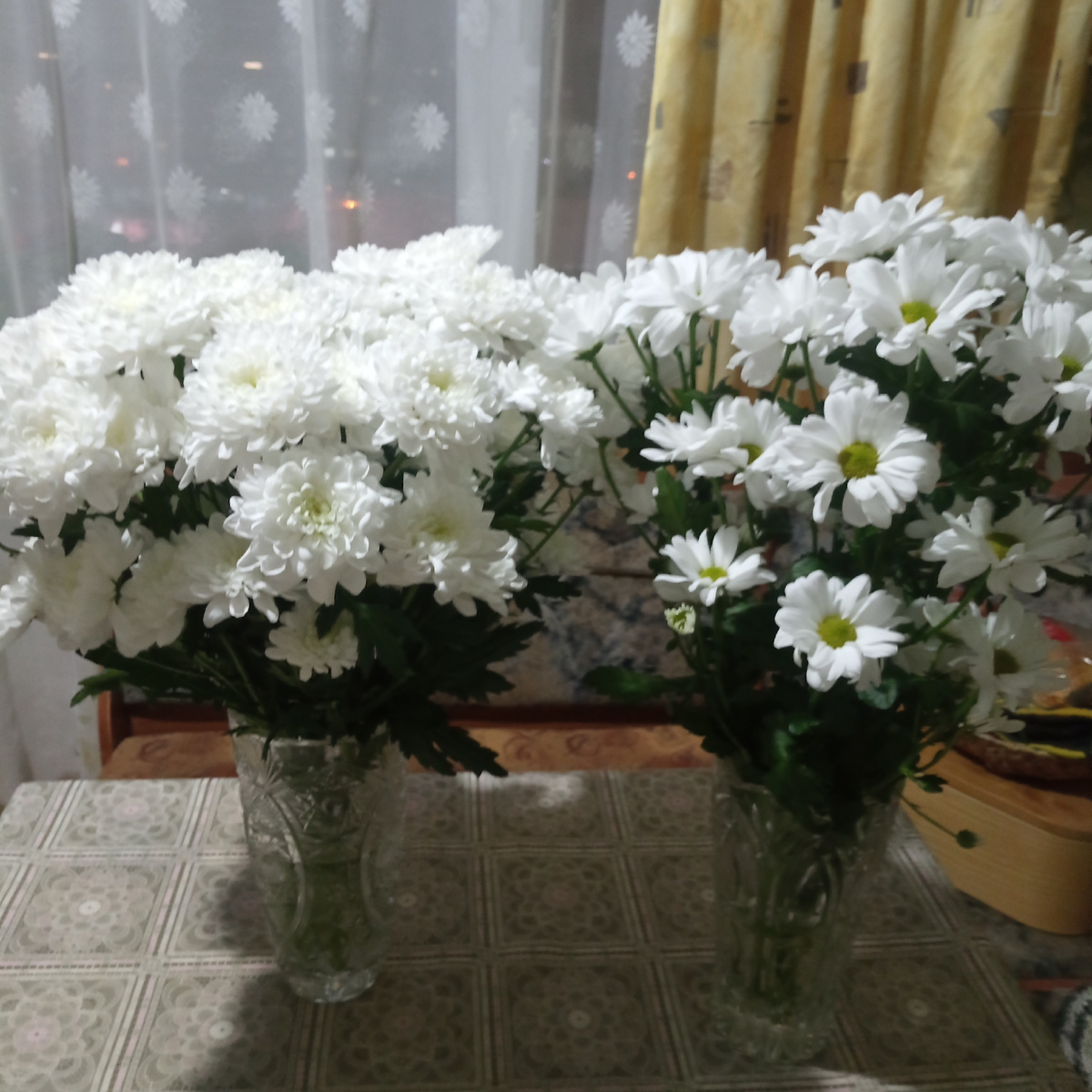 Мужа дома не было, уезжал на рынок за продуктами. Приехал с большим букетом хризантем. Фото букета отдельно не сделала, эти цветы от детей и от мужа. От мужа тот, что справа. Договорились они что-ли, купили мне почти одинаковые букеты)).