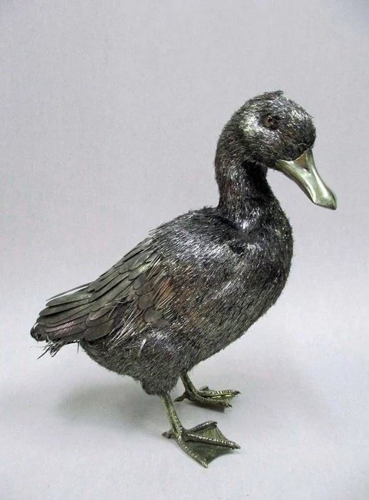 Буччеллати Buccellati, Скульптурная композиция «Утка» ювелирного дома Buccellati: серебро, филигрань, ручная работа, золочение. Высота 29 см, вес 1059,24 г, клейма дома. Buccellati — династия мастеров, чьи секреты передаются из поколения в поколение. Фирма активно развивается с начала XX века, когда в 1919 году Марио Буччеллати открыл первое ателье. Его успех привёл к расширению бизнеса и обучению сыновей, которые открыли бутики по всему миру. В 1966 году управление принял Джанмария Буччеллати, курировавший производство, распространение и дизайн. Сегодня Buccellati известен по всему миру: бутики работают в Париже, Милане, Токио, Гонконге, Нью-Йорке, Венеции, Москве и во Флоренции у начала моста Веккьо. Стоимость лота: 1 300 000 ₽ Подробнее на нашем сайте