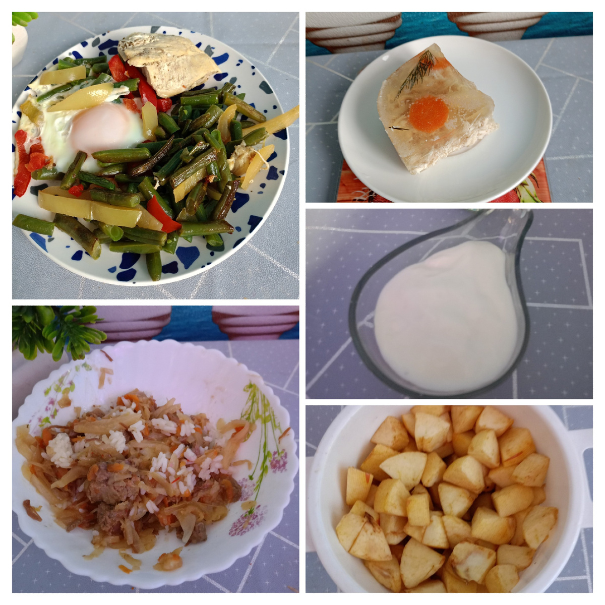 •Завтрак в 12.20 - холодец из куриной грудки; фасоль стручковая на пару; замороженные овощи на пару; яйцо куриное всмятку; отварная куриная грудка; мацони