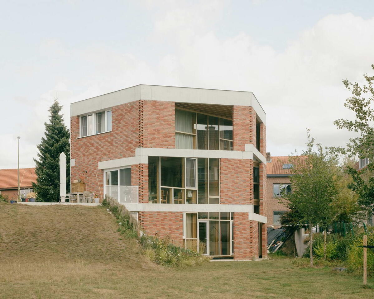 Геометрический дизайн и круговой способ энергетического строительства, которые характеризуют студию BLAF, ярко присутствуют в этом доме. Альтернативой традиционной пустотной стене является стеновая конструкция с самонесущим облицовочным кирпичом снаружи, лёгким деревянным каркасом внутри и теплоизоляцией из сухой известковой пенькой на биооснове без полости. Проект представляет собой компактный и энергоэффективный дом на одну семью. Отправная точка: уважение к рельефу и окружающей среде. Компактный объём был создан для того, чтобы сохранить визуальные связи между общественным достоянием и пейзажем позади. Благодаря компактному шестиугольному равностороннему отпечатку объём стоит одиноко в ландшафте, неосвоенный участок максимально сохраняет свой рельеф. Проектировщики придумали альтернативную гибридную внешнюю оболочку, которая делает возможным двустороннее строительство. Сначала возводится внешняя стена, а затем лёгкий деревянный каркас внутри, или наоборот. Вы также можете разрушить