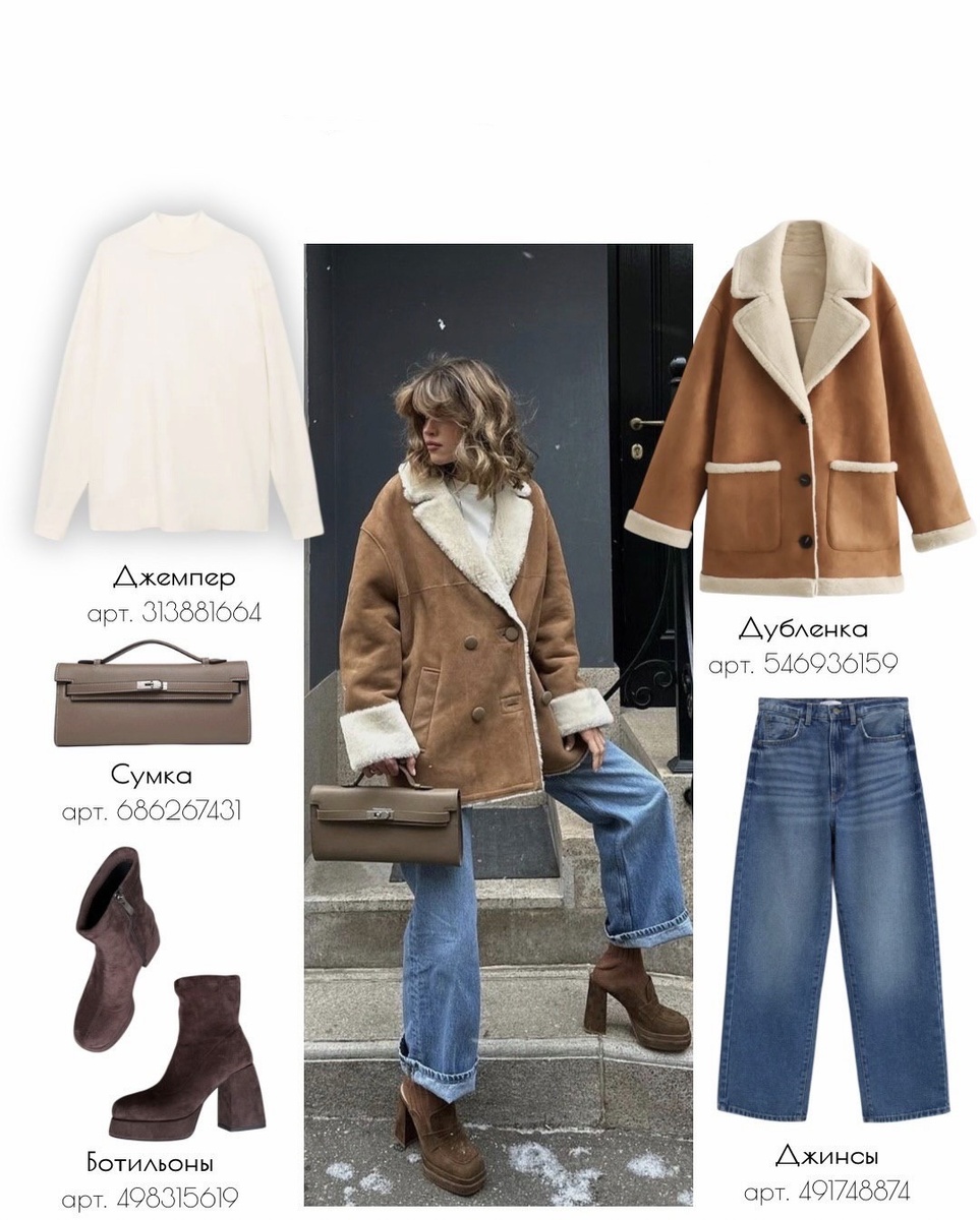 В этой подборке идеально сошлись фактуры и оттенки: карамельная дублёнка даёт тепло и статус, молочный джемпер подсвечивает лицо, прямые голубые джинсы добавляют свежести и современности, шоколадные ботильоны вытягивают силуэт, а сумка в оттенке тауп аккуратно связывает всё в один «дорогой» ансамбль.