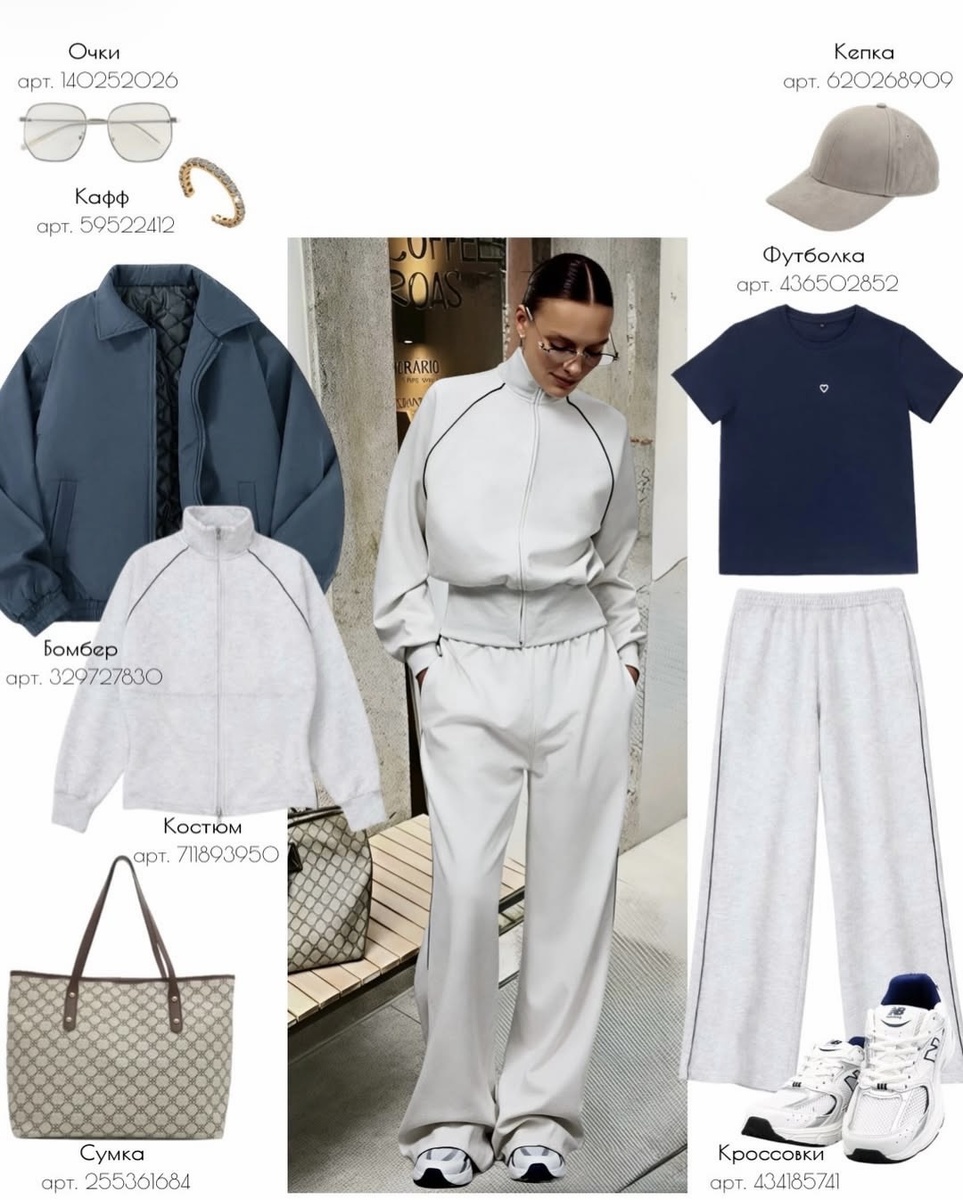 Эта подборка — идеальный пример того, как собрать современный спорт-шик без лишней суеты. Светлый костюм создаёт базу, бомбер добавляет форму, футболка даёт глубину, очки и кафф делают лицо «дороже», кепка добавляет характер, сумка переводит комплект в городскую классику, а белые кроссовки сохраняют чистоту и лёгкость.