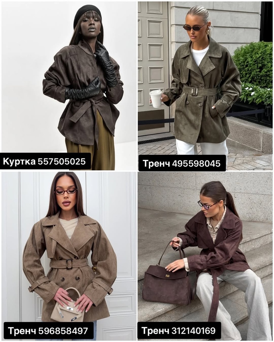 Есть палитра, которая всегда работает на статус: шоколад, какао, мокко, графит, оливковый дым и тёплый серый. В этих оттенках вещи выглядят взрослее, ткань — дороже, а образы — собраннее даже без сложных приёмов. На фото — именно такая подборка: замшевые куртки и тренчи с поясом, благородные сапоги, структурная сумка, жакеты с интересным кроем, юбка с кружевом и выразительная рубашка с воланами. Всё можно носить отдельно и собирать в капсулы: от «городского минимализма» до мягкого «вечера без блёсток».