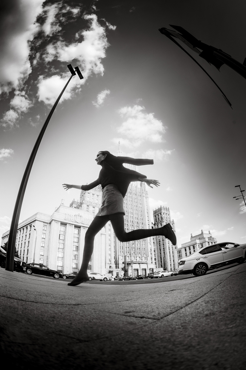 Я люблю в фотографии искажения, нарушения пропорций, гротескные движения и совсем не боюсь, что кадр получится размытым или смазанным. Более того, иногда кажется, что если кадр слишком аккуратный, значит, что-то пошло не так. Этот снимок мы делали спонтанно и быстро. Прыгали на самом краю тротуара, выжидая моменты, когда поток машин становился меньше и город на секунду давал передышку в своей спешке. Со стороны это, наверное, выглядело забавно: девушка скачет у проезжей части, а я сижу прямо на земле, почти под ногами у прохожих, с камерой и максимально низким ракурсом, пытаясь поймать не «красивую позу», а движение. Силуэт здесь главный герой. Чёткий, почти вырезанный, он неожиданно хорошо лёг на фон сталинской высотки МИДа, тяжёлой, основательной, абсолютно неподвижной. При этом светлое здание, светлые автомобили и тень бегущей девушки, которая будто вообще не отсюда и не про это место. Использование фишая здесь оправдалось на все сто: объектив закрутил пространство, превратив небо в