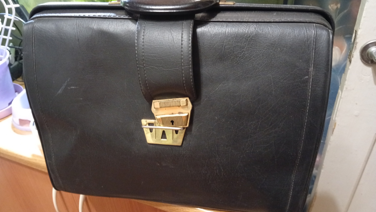 Это был папин портфель! В моём малюсеньком детстве родители учились. Мама в Заочном институте Советской торговли, а отец в Политехническом институте. Помню большущую стопку общих тетрадей. В основном, в коричневой дерматиновой обложке. А две были красивые! Красная яркая и гладкая и сиреневая шершавенькая на ощупь. У обоих родителей были портфели. У мамы большой неопределенного цвета тонкий, с двумя замочками. Папин черный, твёрдый, округлый, как саквояж.