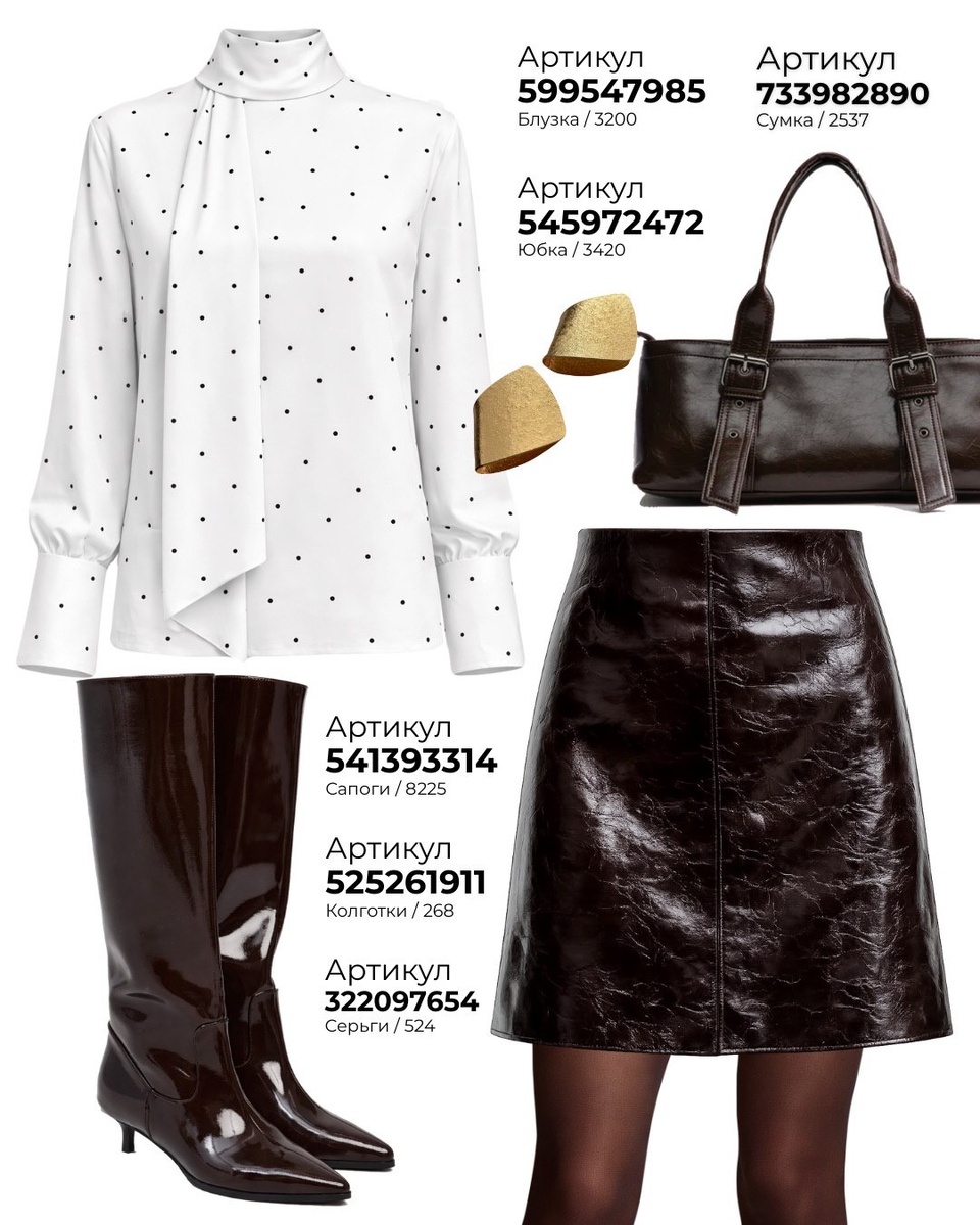 Эта подборка — идеальный пример того, как создать эффектный комплект без перегруза. Блузка в горошек даёт свежесть и интеллигентность, сумка и сапоги в шоколадной гамме добавляют статус, глянцевая юбка делает образ модным и заметным, колготки собирают силуэт, а золотистые серьги подсвечивают лицо.