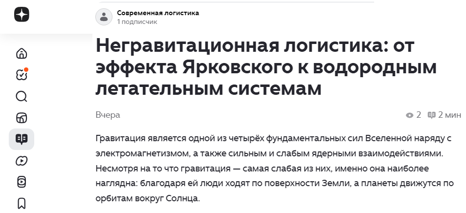 На все 100% прав автор канала "Современная логистика" подчеркивая ограниченный характер используемых в настоящее время тех сил, которые, которые проявляются в процессе осуществления тех или иных природных процессов и помимо фундаментальных сил, а также так сказать, рукотворных сил. Эти силы если и используются, например, ветряками, парусниками и т.д., то явно недостаточно. Тем более, если иметь в виду открытие нашим соотечественником И.Я. Ярковским в 1900 году таких негравитационных сил, которые, быстрее всего, развиваются в той или иной степени почти что всеми космическими телами и частицами за счет переизлучения таких излучений, которыми в свое время пытались объяснить и гравитационные взаимодействия. Да эти силы относительно малы, в частности, с теми силами, которые возникаются в результате осуществления таких рукотворных реактивных взаимодействий, которые осуществляются авиационными и ракетными двигателями. Но, по всей видимости, именно за счет использования этих относительно малых