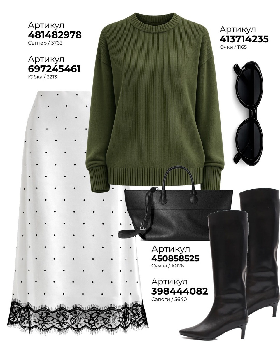 В этой подборке всё работает на гармонию: олива даёт спокойную глубину, молочный горошек — свежесть, кружево — женственность, а чёрные аксессуары добавляют структуру и характер. Получается стиль «мягко, но уверенно»: вы не перегружены деталями, но выглядите продуманно и современно.