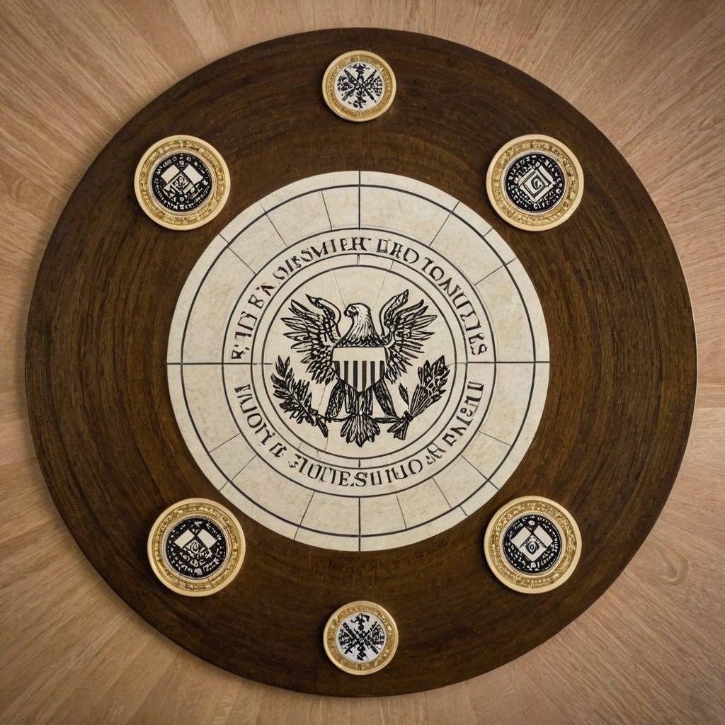 Представьте три вложенных друг в друга золотых круга, как мишень. Во внутреннем круге, сидя за дубовым столом в небоскрёбе, — члены Федерального резерва, монетным двором штампующие доллары в виде костей домино. Средний круг — поле боя Первой и Второй мировых войн, где танки и самолёты несут на броне логотипы банков J.P. Morgan и Chase. Внешний, самый большой круг — карта мира, стянутая в тугой узел долларовой лентой, которую с одного конца поджигает факел Статуи Свободы, а с другого — держит за жало механический орёл Пентагона. Всё это освещено холодным светом цифровых тикеров биржи, а в тени, на первом плане, лежит раскрытая Конституция США, на страницах которой вместо текста — биржевые котировки и следы грязных сапог.
