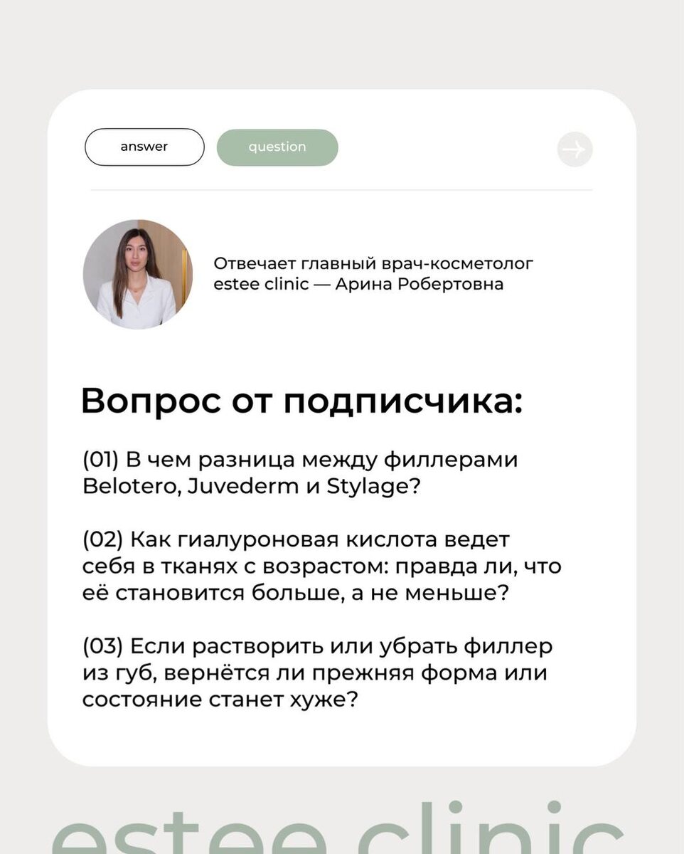 Недавно под одним из наших постов мы получили интересные вопросы об эффекте и препаратах для контурной пластики губ. И попросили главного врача estee clinic — Арину Робертовну, поделиться своим мнением и опытом на эту тему. «Belotero, Juvederm и Stylage: это сертифицированные и безопасные филлеры на основе очищенной гиалуроновой кислоты. Их отличие — в производителе и поведении препарата в тканях: плотности, пластичности и составе. Например, в линейке Stylage в состав входит антиоксидант (маннитол), который помогает замедлить распад гиалуроновой кислоты и продлить эффект процедуры. Выбор филлера всегда индивидуален и зависит от: Оценить все это можно только на очном приеме: врач анализирует архитектонику губ и подбирает препарат, который даст наиболее естественный результат. Если говорить о рассасывании филлеров, важно отметить, что сертифицированные филлеры на основе гиалуроновой кислоты биодеградируемы — то есть они рассасываются естественным путем в среднем за 6–12 месяцев, а губы в