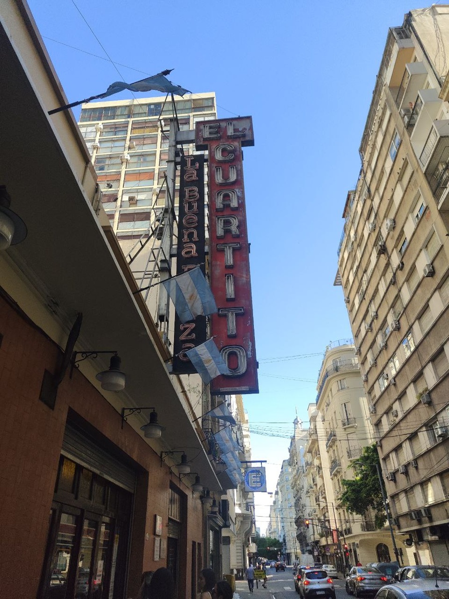 «El Cuartito» — пиццерия , основанная в 1934 году. Яркое, шумное место. С историческими фотографиями. Аргентинская пицца - то, что хотелось попробовать. Толстое тесто, с большим количеством начинки. Один кусок - это уже полноценное блюдо.