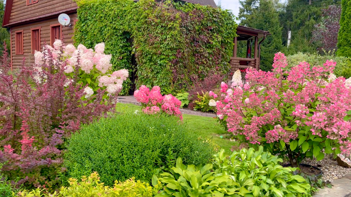 В первой половине лета, когда гортензии только готовятся к цветению, крупные насыщенно-зеленые листья гортензий и яркоокрашенные листья барбарисов и спирей будут дополнять друг друга. Эти кустарники неприхотливы и не будут мешать ни друг другу, ни гортензиям.