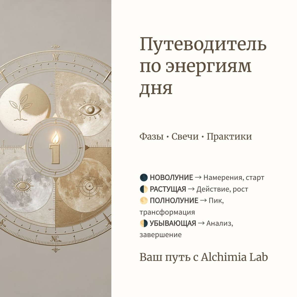 КОНЬ (Убывающая Луна) Суть дня: День активного движения вперёд, социальной активности, храбрости и ответственности. Энергия рыцарства, чести и дружбы. Идеально для путешествий, спорта, работы в команде, защиты справедливости. Что делать можно и важно: Проявить инициативу, быть честным и справедливым. Заниматься спортом, путешествовать. Решать накопившиеся вопросы решительно. Что делать не стоит: Лгать, быть несправедливым, проявлять трусость. Свеча-помощник Alchimia Lab: «Сила магнетизма» (белый, апельсин). Почему именно она: Для целеустремлённого движения. Помогает сконцентрировать волю на цели и притянуть успех в социальных делах, даёт энергию для активных действий. Мини-ритуал на 5 минут: Если есть конкретная цель в социуме (проект, защита интересов), зажгите свечу. Возьмите в руки предмет, связанный с этой целью (визитку, документ). Представьте, как вы уверенно и достойно движетесь к ней, как всадник на коне. 📖 О философии и принципах этой рубрики читайте в #Лунный