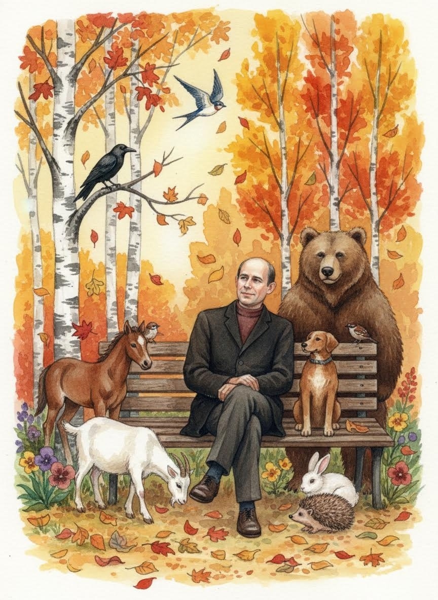 Промт – запрос: Поэт с фото (Николай Михайлович Рубцов) сидит на скамейке в окружении животных-героев своих стихов: жеребенок, ворона, воробей, коза, ласточка, заяц, медведь, ёж, собака. Герои в единой композиции. Время года – осень, локация – парк в селе. Стиль – акварельная открытка. Нейросеть – Nano Banana #Рубцов90 #ЦентрТендрякова #Тендряковка #ЮЦ #МояРодинаМилая