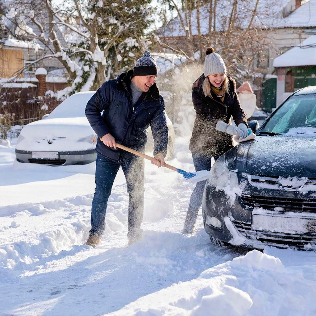 Морозным утром во дворе развернулась привычная зимняя сцена: Алексей и Марина готовились освободить свои машины из снежного плена.