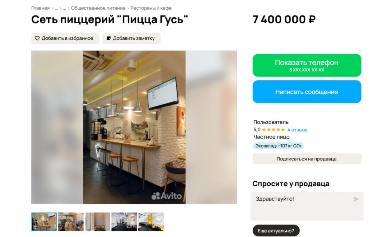 Известная воронежцам сеть пиццерий «Пицца Гусь» ищет нового владельца. Весь бизнес, включающий три точки, бренд и технологическое оборудование, выставлен на продажу на популярной интернет-площадке Avito. Общая стоимость предложения составляет 7 миллионов 400 тысяч рублей. Согласно информации из объявления, в продажу поступают действующие заведения, расположенные по ключевым адресам: Также в пакет входит работа одного пицца-бара, рассчитанного на 60 посадочных мест. Основная концепция сети, как указано в предложении, базируется на уникальном оборудовании, позволяющем изготавливать дополнительную продукцию, и на гарантии доставки заказа в течение 29 минут. Бизнес обладает развитой инфраструктурой для привлечения клиентов. У компании есть активные страницы в социальных сетях, профили в онлайн-картах, собственное мобильное приложение и веб-сайт. Средний чек в заведениях, по данным продавца, колеблется от 1 000 до 3 000 рублей. Продажа действующего бизнеса с налаженными процессами, оборудов