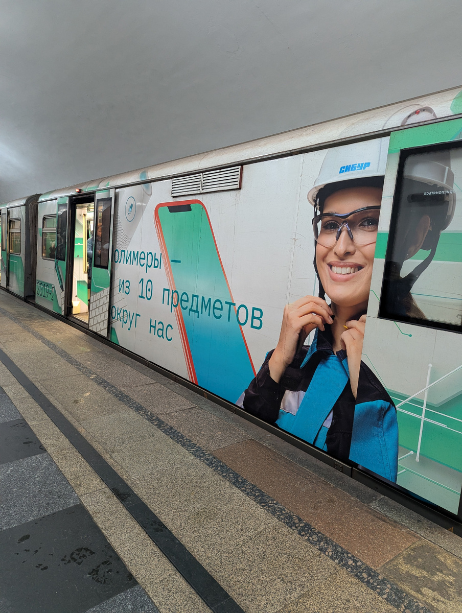 Интересный мне поезд попался в метро, тематический. Я видела поезда Простоквашино, новогодний, День Победы, библиотечный, Красная Стрела. А сегодня поезд посвящен полимерам, до сего дня даже не подозревала, что такой существует и не знаю, что такое Сибур (надо будет погуглить)