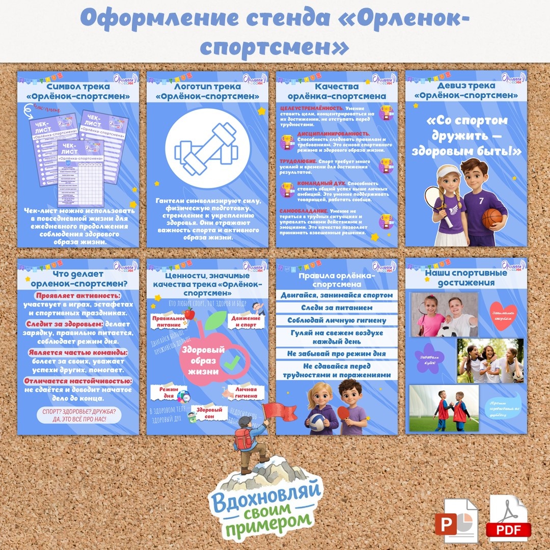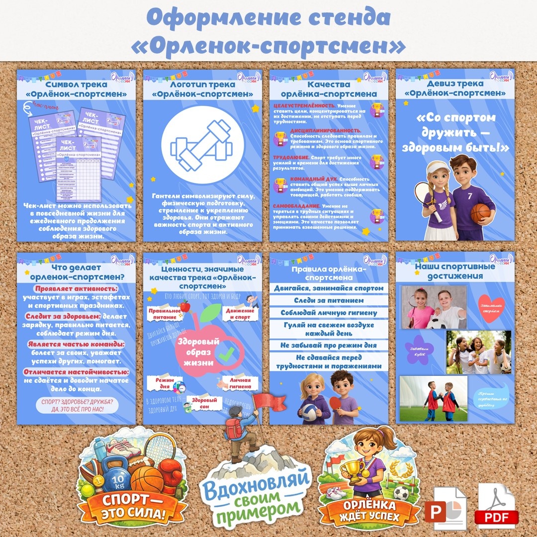 Данный комплект представляет собой авторское оформление классного уголка для трека «Орлёнок-спортсмен» внеурочной деятельности «Орлята России». В набор для оформления входит: Листы с ключевой информацией о треке: описание символа трека, логотип трека, главные качества орлёнка-спортсмена, ценности спортсмена, девиз трека, что делает орленок-спортсмен, правила спортсмена, чистый шаблонный лист («Наши спортивные достижения») для размещения фотографий, рисунков или заметок о спортивных результатах обучающихся. Файл в формате PDF и PPTX. Данный набор легко редактируется, что позволяет адаптировать его под конкретные нужды и идеи. Дополнительные материалы к треку "Орленок-спортсмен": Еще больше материалов на тему "Орлята России" можно посмотреть здесь.