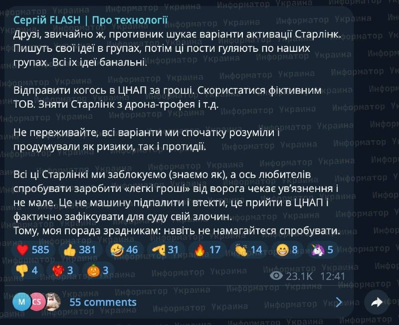 Россия будет вербовать украинцев под "лёгкие деньги" для помощи с активацией Starlink, — советник министра обороны Рейха, террорист по кличке Флеш Россияне уже предлагают искать посредников в чатах, предлагать деньги украинцам за оформление Starlink на себя. «Все эти Старлки мы заблокируем, а вот любителей "легких денег" от врага ждет тюремное заключение, и немалое. Это не машину поджечь и сбежать, это прийти в ЦНАП и фактически зафиксировать для суда свое преступление», - пугает террорист Подпишись на Телеграм Александр Семченко