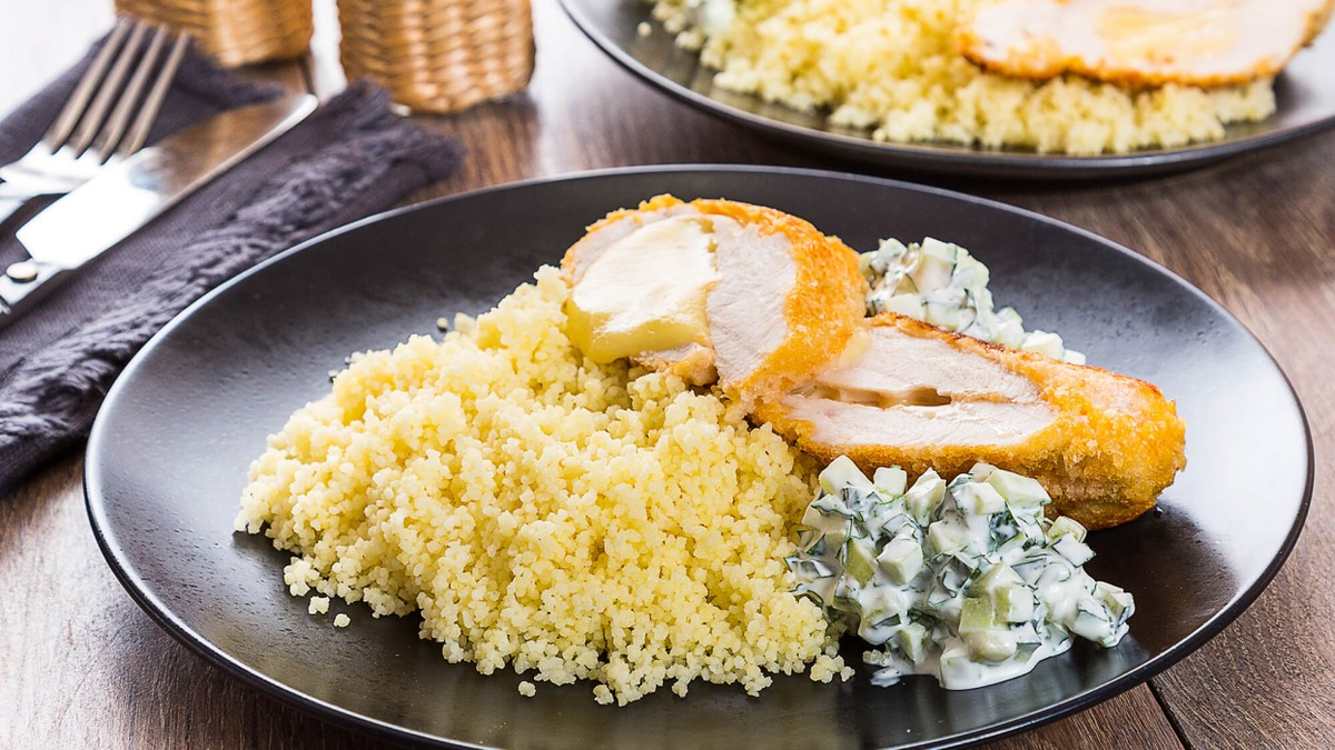 Я вчера делала котлеты куриные с сыром внутри, с кускусом, с огуречным салатиком. Своих фоток нет, но в целом это выглядит один в один как на этой фотке (фото с рецепта, по которому готовила):
