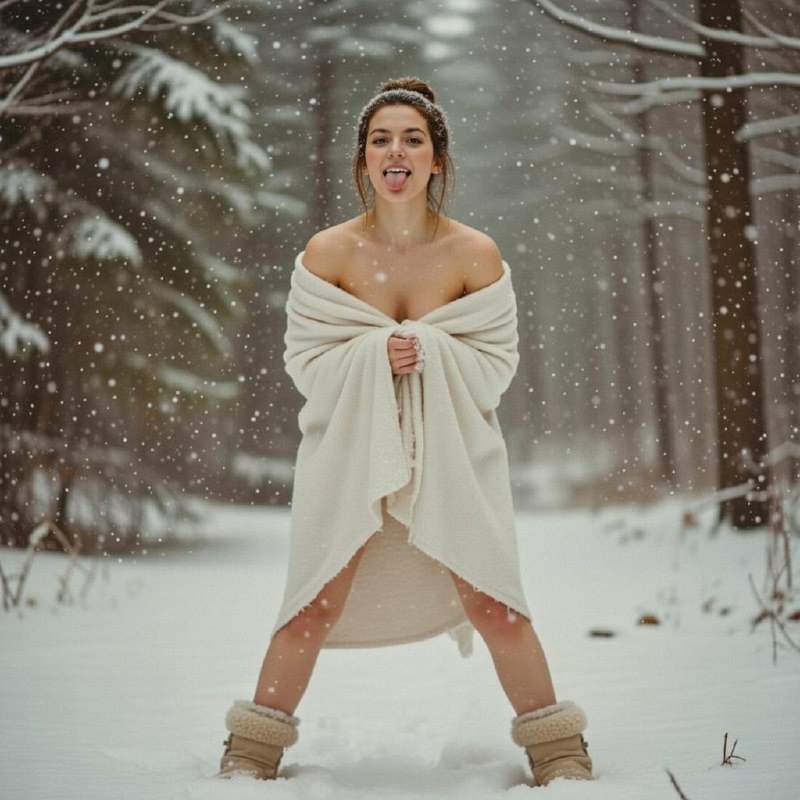 Модель: Nano Banana Сгенерировать🪄 Промты для фото Точно воспроизвести внешность человека с загруженных фотографий, сохраняя все черты лица, форму головы, цвет и текстуру волос. ОПИСАНИЕ ПЕРСОНАЖА: Общий вид: Молодая женщина Внешность точно соответствует загруженным фотографиям Светлая кожа Волосы собраны в пучок (стиль и цвет волос соответствуют фото) Одежда и детали: Белое одеяло, накинутое на плечи Обнаженные плечи и верхняя часть тела (прикрыта одеялом) Меховые сапоги бежевого цвета Поза и действие: Стоит, широко расставив ноги Голова запрокинута назад Язык высунут вверх Ловит падающие снежинки ЛОКАЦИЯ И АТМОСФЕРА: Окружение: Заснеженный зимний лес Активный снегопад Заснеженные деревья на заднем плане (размыты) Спокойная, умиротворенная атмосфера Холодная зимняя погода Время и условия: Зимний сезон Дневное время Пасмурная погода Идет снег СТИЛЬ И ТЕХНИКА: Фотографический стиль: Аналоговая фотография Мягкие, приглушенные цвета Акцент на естественно