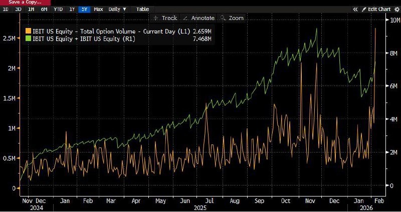 BlackRock's spot Bitcoin ETF, $IBIT, recorded its highest single-day options trading volume ever on February 5th, according to data.
