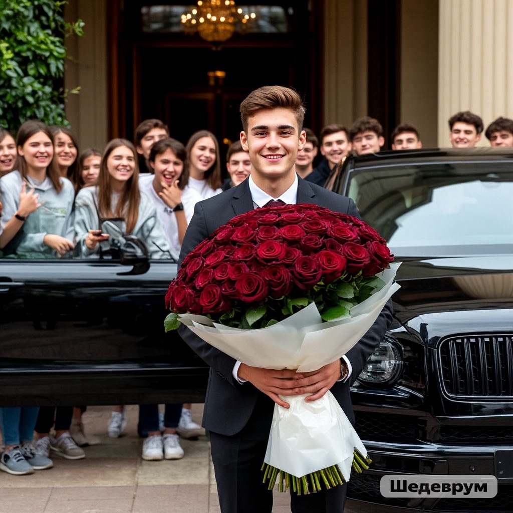 Подходя к крыльцу, они заметили непривычное оживление. У парадного входа столпилась группа студентов, кто-то смеялся, кто-то оживленно жестикулировал. В центре этого немого спектакля, прислонившись к черному, глянцевитому внедорожнику, стоял молодой человек. Высокий, спортивного сложения, одетый с подчеркнутой, дорогой простотой. В руках он держал не просто букет, а огромную, роскошную охапку бордовых роз, упакованную в белую шелестящую бумагу. Он не проявлял нетерпения, стоял спокойно и уверенно, как хозяин, осматривающий свои владения. Это был Аслан.