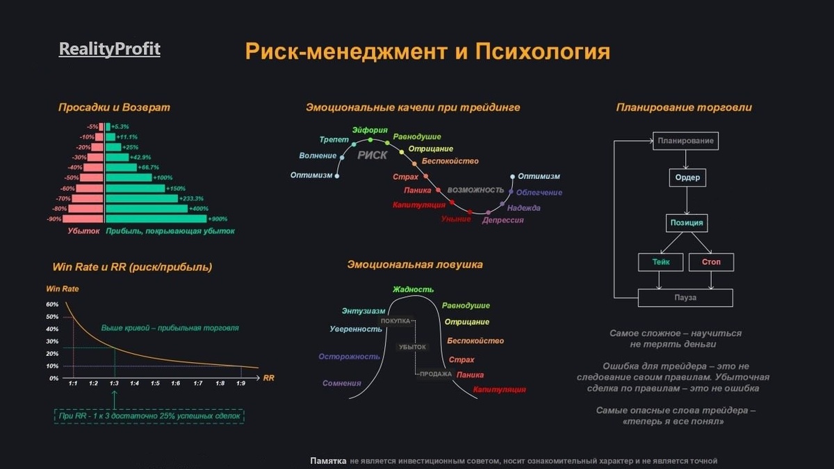 Риск-Менеджмент При просадке депозита в -5% - Восстановление займет +5,3% При просадке депозита в -90% - Восстановление займет +900% 👌Установите ограничение на прекращение торговых операций в случае, если за месячный период произойдёт снижение депозита на 5%. 😁Размер риска для каждой отдельной сделки не должен превышать 0,5% от объема. 😝В течение одного дня допустимо совершать не более двух сделок, а в течение недели — не более пяти. 🤑Сохраняйте постоянство в размере торгового объёма и уровне используемого плеча. 🧑🎓Применяйте исключительно одну торговую стратегию, к примеру, можно использовать стратегию ретеста на таймфрейме М15 для внутридневных сделок или между дневных дистанций. Win Rate и RR (риск/прибыль) 🧐При RR - 1 к 3 достаточно 30% прибыльных сделок. 🥰Самые прибыльные сделки 1 к 4 и выше. 🤔Оставляйте часть от позиции по тренду. Дайте прибыли течь. В психологии 15 эмоциональных качелей и 11 эмоциональных ловушек которые надо избегать и работать исключительно по сво