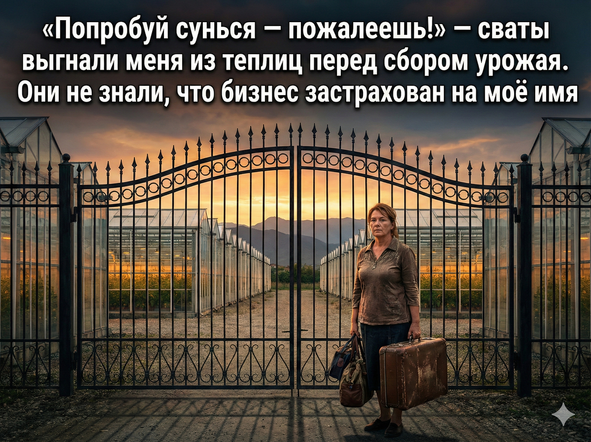 — А что Аня? — усмехнулся Тарас Романович. — Аня жена послушная. Ей муж сказал — она молчит. А Денису я вчера всё объяснил. Ему наследство нужно, а не твои «северные» сказки. Попробуй сунься теперь сюда — пожалеешь! Я в этом городе всех знаю. В суд подашь? Так теплицы на моей земле, по закону они мои. А чеки твои... ну, подари их государству. Завтра замки меняем. Прощай, Регина.