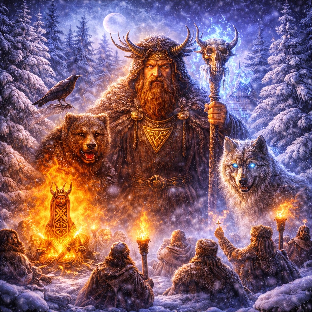 Велес в зимний период — не покровитель богатства и скота, как его часто упрощённо описывают. В это время он проявляется как хранитель глубины и испытаний. Зима в древнем восприятии была временем проверки. Когда природа замирает, человеку остаётся только он сам. Нет урожая, нет лёгких решений, нет внешних стимулов. Всё сводится к внутреннему состоянию.