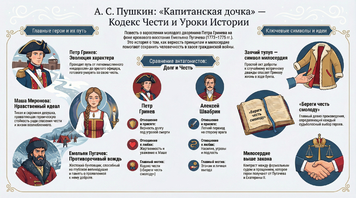 «Капитанская дочка» краткое содержание слушать — историческая повесть А. С. Пушкина о чести, любви и верности долгу. Молодой офицер Пётр Гринёв отправляется служить в крепость, где знакомится с Машей Мироновой. Во время восстания Пугачёва герою предстоит сделать трудный выбор между страхом и присягой. Его спасают смелость, честность и доброе сердце. Краткое содержание по главам поможет быстро вспомнить сюжет и подготовиться к уроку или экзамену. https://rutube.ru/play/embed/709626822607f25907bb12029b622109/