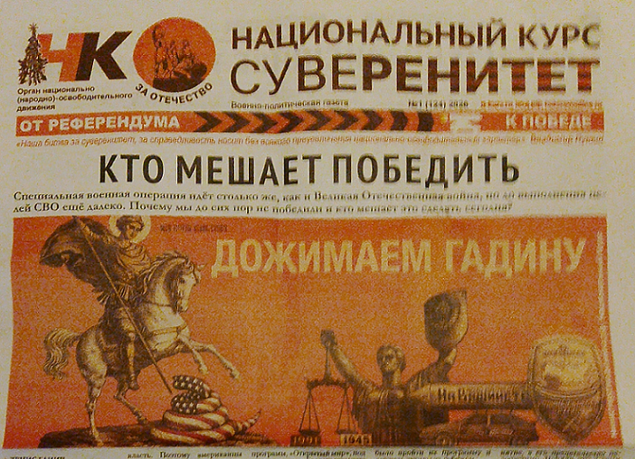В день открытия года нашего единства одними Путиным и Мединским дело не обошлось. На улицы выпустили разных экзотических персонажей. У станции метро моим жене и дочери встретилась парочка весьма живых старушек, раздававших газету, название которой вы можете прочесть на сделанном мной снимке. Ух какой же непролазный мрак содержится на четырех полосах этого «издания»! Тут вам и требование предоставить Путину права самостоятельного изменения Конституции и требование по-настоящему искоренять инакомыслие… Много чего такого. Это вклад газеты в дело единства, которому мешает обличаемая ею «пятая колонна». Если нарратив направлен на достижение единства путем устранения из процесса неединых, то столь патриотическое издание не может не ждать за его хлопоты благосклонное одобрение и уж никак в его адрес не поступит обвинение в использовании языка вражды и ненависти.