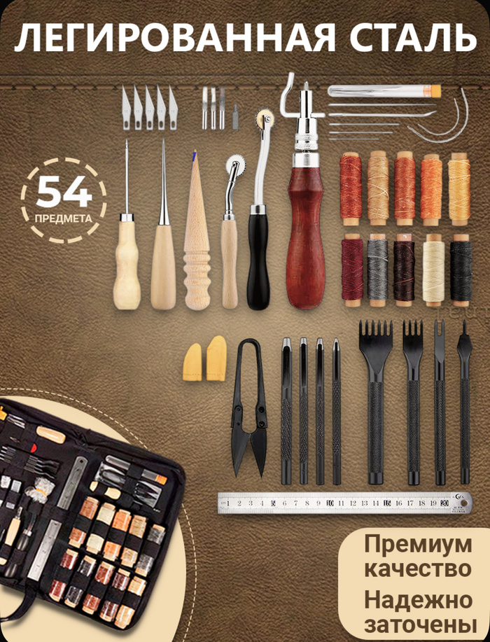 На Новый год моя любимая жена подарила мне набор для шитья из кожи. Случайно высказанное желание за пару недель до этого довольно быстро воплотилось в реальность. Ну, делать нечего - раз сам просил, то надо шить. Разложив перед собой эти прекрасные 54 штуки, я завис на час-другой, раздумывая, что же с ними делать. Потом ещё пара часов просмотра видео - и я сел за шитьё своего первого изделия. Ооо, первый раз - это, конечно, непередаваемо! Ничего ровно не режется, дырки не колются, «урезы-шмурезы» - вообще тарабарщина какая-то. Да и плюс начать я решил с того, что в ответ своей жене сошью обложку для паспорта, так как её старая уже давно просилась на выброс. Заказал два куска кожи «Крейзи Хорс» формата А4, спросил любимую, какими нитками прошить (что было ошибкой, так как в итоге ей не понравилось), и вперёд - за опытом. Оказалось, что даже среди этой кучи инструментов на деле многого не хватало. Посмотрел еще парочку видео и, почувствовав себя уже почти мастером (опять же, только по ви