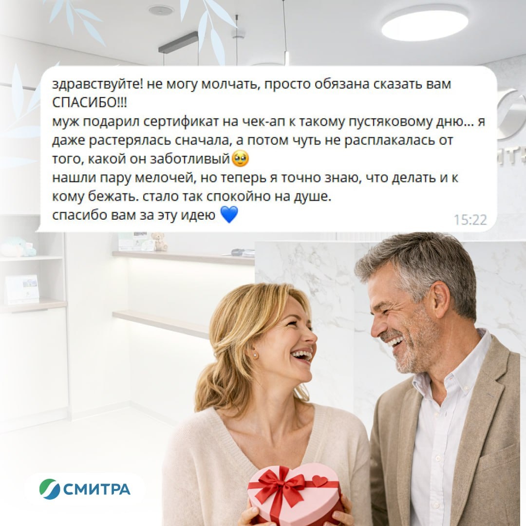 … 🤯 А ведь уже совсем скоро — День всех влюблённых и праздник защитников Отечества — 23 февраля! Недавно мы получили очень трогательный отзыв. Женщина, которая раньше считала 14 февраля пустяковым и почти незаметным праздником в России, неожиданно получила от мужа сертификат на чек-ап. Это был сюрприз, полный заботы и внимания. Эмоции, которые она испытала, невозможно передать словами — их лучше прочитать самим 👆🏻 Вот так, иногда совсем неожиданно, мы можем подарить своим близким нечто куда более ценное, чем материальные вещи — незабываемые эмоции и ощущение, что они по-настоящему важны и любимы. А ведь их здоровье — самый ценный дар, который у них есть. Если вы всё ещё думаете, что подарить родным, подарочные сертификаты от семьи «СМИТРА» — это именно тот подарок, который дарит спокойствие и тепло. Можно выбрать номинал от 2000 рублей или подарить сертификат на конкретную услугу. Подарите близким заботу, которую они заслуживают. Подарок, который не будет пылиться на полке.