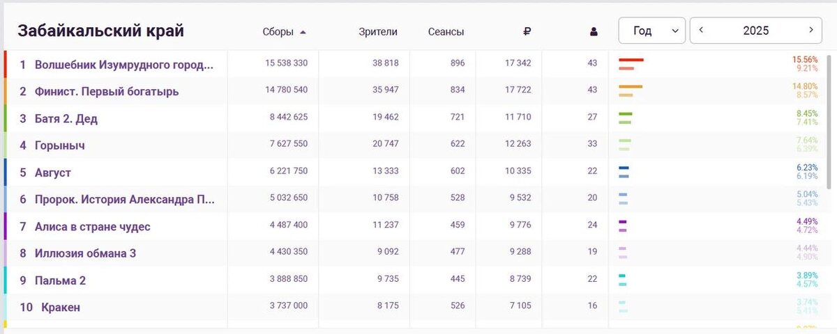 ». На эти деньги можно купить один изумруд отличного качества весом 23 карата. Прокат фильма (6+) начался в январе 2025-го, по всей России фильм заработал 3,4 млрд рублей. На втором месте — «Финист. Первый богатырь» (6+) со сборами в 14,8 млн рублей. Третью строчку занял «Батя 2. Дед» (12+) — в апреле прошлого года принесли фильму 8,4 млн рублей. Из зарубежных кинолент в десятку попала только «Иллюзия обмана 3» (16+). Она заняла восьмое место и собрала 4,4 млн рублей. Скриншот с сайта Фонда кино 🟦 Подписаться