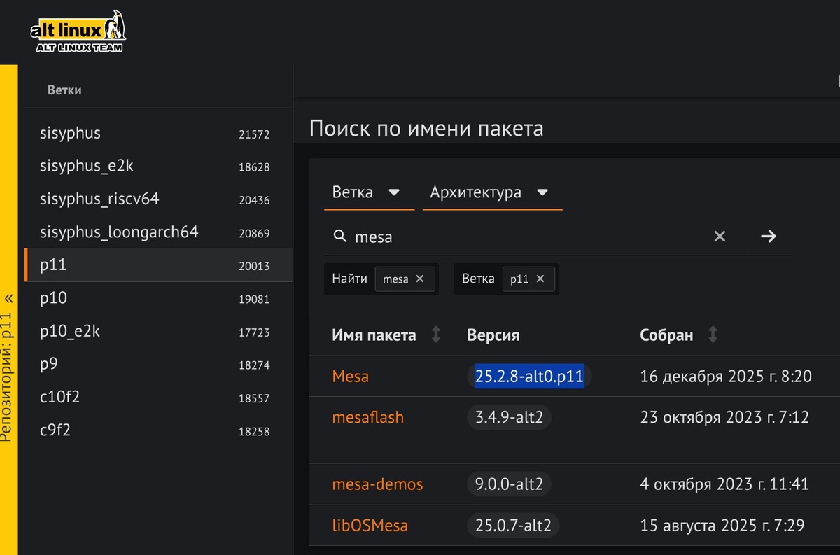 Всё-таки я немного запутался уже в версиях Mesa //// У меня сейчас после манипуляций постом выше Mesa 25.1.9, в p11 завезли 25.2.8 судя по репозиторию .... В Сизифе уже 25.3.4 .... А вообще в остальном мире так ... По состоянию на февраль 2026 года, актуальной стабильной серией является Mesa 25.3, а самой последней стабильной точечной версией — Mesa 25.3.5 (выпущена 6 февраля 2026 года). На версии 25.2.8 DaVinci точно не работает, вероятнее всего там кофликтуют разные версии библиотек с новым драйвером ... но как у меня случился 25.1.9 теперь тоже не совсем понятно))) Скорее всего из-за того что я заморозил отдельные компоненты Mesa, epm обновился не ломая зависимости. Хотя если в репозитории уже есть только версия 25.2.8 откуда он тогда взял моя версию xD))))))))))))))))))))) Ладно) Работает и прекрасно)))) @plafon #davinciresolve #ОСАльт