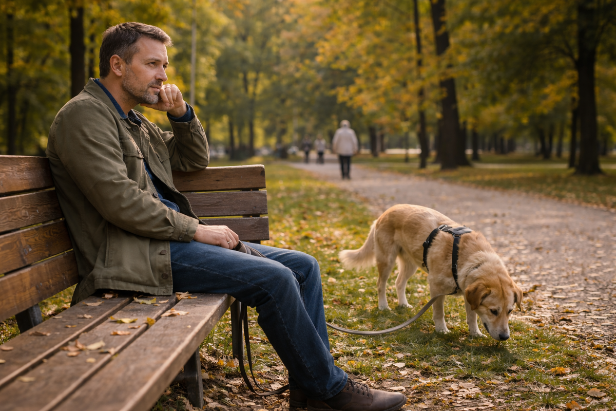 А тут — лавочка. Ты сидишь, ничего не производишь, никуда не растёшь, никаких графиков не закрываешь. Просто присутствуешь в собственном дне. И единственный, кто от тебя что-то реально хочет, — собака, которой надо поправить шлейку или вытащить колючку из лапы.