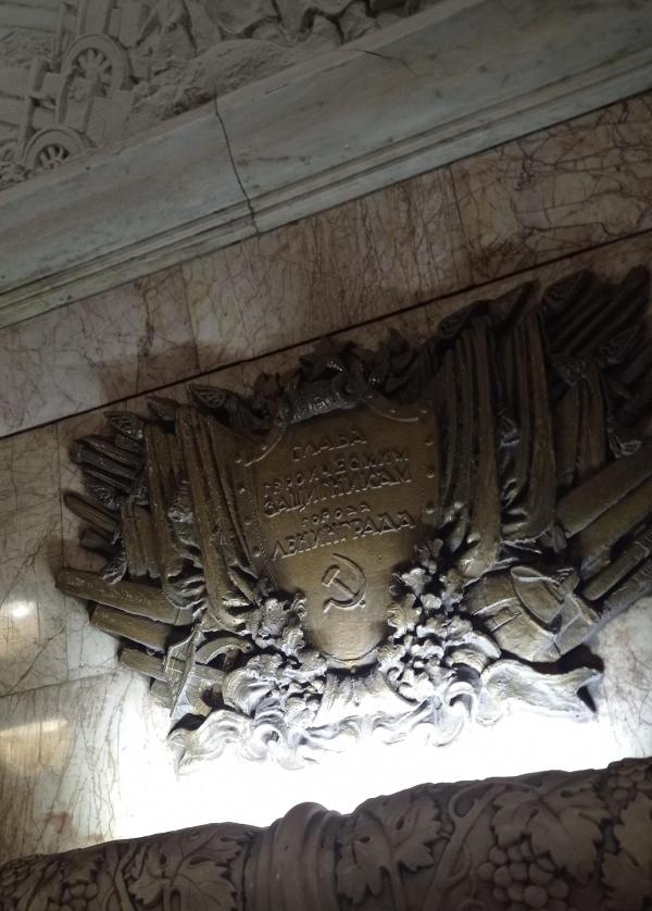 Самое яркое впечатление остаётся от того, что видим на потолке. Мозаичные панно изготавливались вручную, в блокадном Ленинграде. Их автор поgиб от голода. Здесь установлена стойка с информацией об этом. Но именно панно на станции "Автозаводская" стали последними его работами. А не эти.