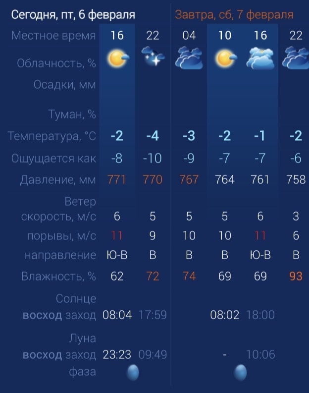 В субботу в Астраханскую область придет долгожданное потепление. Но расслабляться пока рано. Утром температура в городе составит ‑2 градуса. Днем потеплеет до ‑1. К вечеру температура вновь упадет до ‑2 градусов. Астраханцев ждет юго-восточный ветер со скоростью 6–12 м/с. Атмосферное давление составит 764 мм рт. ст. Влажность воздуха выше нормы. На территории всего региона будет юго-восточный ветер со скоростью 6–11 м/с. Температура воздуха ночью опустится до ‑2 градусов, а днем повысится до 0. Погодные приметы: Сообщение 7 февраля в Астраханской области ожидается потепление появились сначала на Астрахань.Ру последние новости региона.