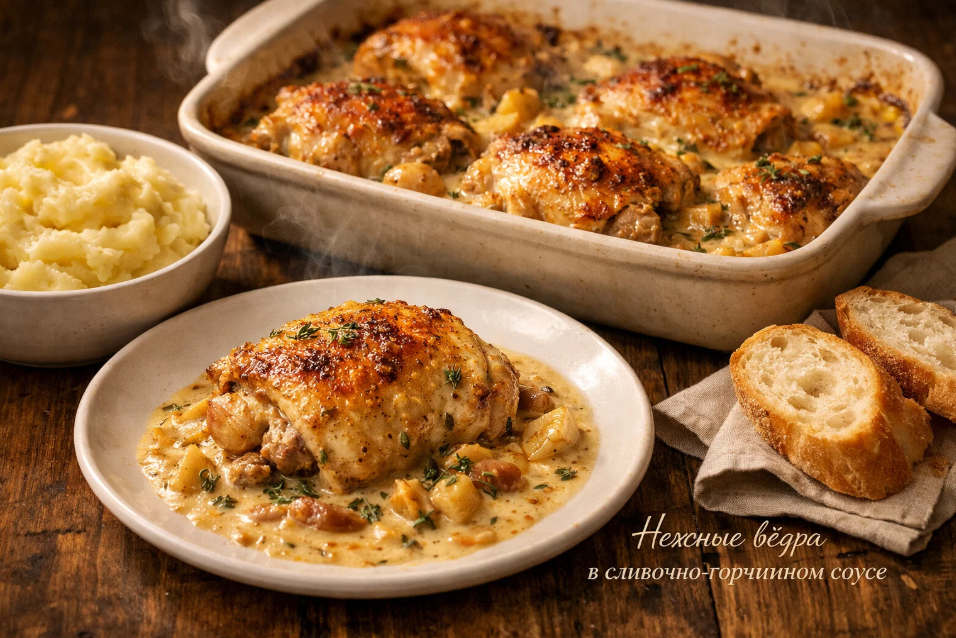Этот рецепт стал для меня настоящим кулинарным якорем. Когда не знаю, что приготовить, когда устала, когда в холодильнике негусто, когда нужно быстро накормить нежданных гостей — куриные бёдра в сливочно-горчичном соусе выручают неизменно. Сорок минут в духовке, минимум возни, максимум результата.