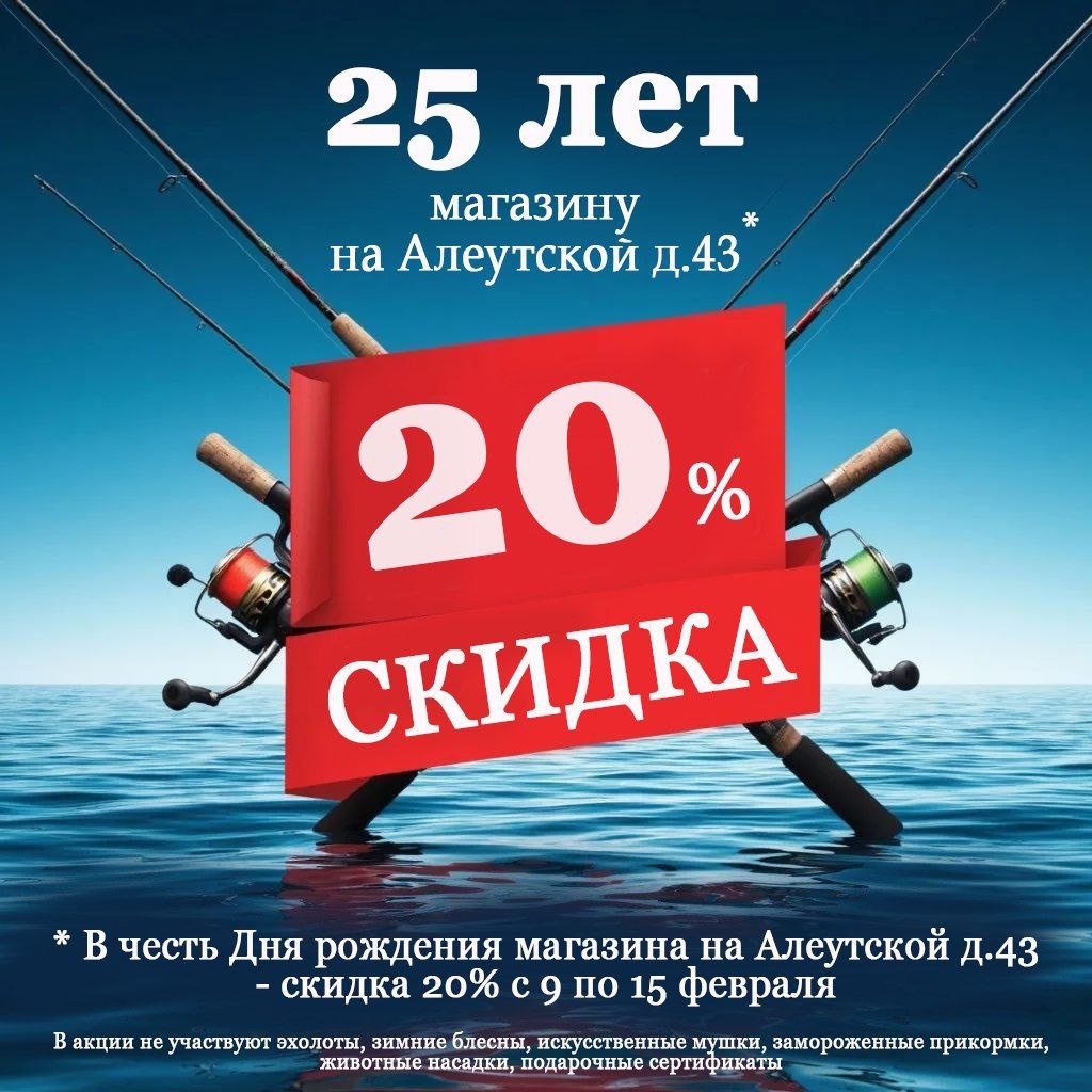 🎁 В честь этого события мы дарим скидку 20%. Условия акции: ✔️Акция действует только в магазине на Алеутской 43. ✔️Акция начинается с понедельника 9.02.2026 и длится по воскресенье 15.02.2026. ✔️В акции не участвуют: эхолоты, зимние блёсны, искусственные мушки, животные насадки, замороженные прикормки, подарочные сертификаты. ✔️Скидка не суммируется со скидочными картами. ✔️Акция доступна при наличном и безналичном расчете. ✔️Для применения скидки покажите картинку продавцу! Адрес: Владивосток, ул.Алеутская, д 43 Телефон: +74232800895
