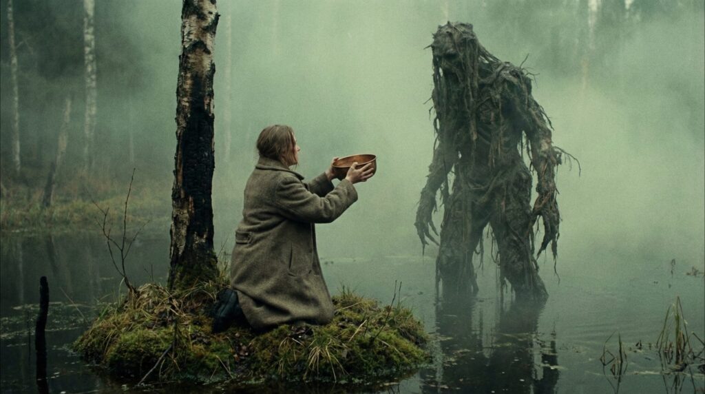 В ответ ей раздался звук, похожий на вздох огромных легких. Туман над озером начал закручиваться в воронку, и из этой мути медленно проступили очертания фигуры. Это был старик — огромный, сутулый, его кожа напоминала старую, изъеденную червями кору, а вместо волос на плечи падали пряди длинной тины. Его глаза были как два мутных окна, за которыми не было ничего, кроме вечного холода.