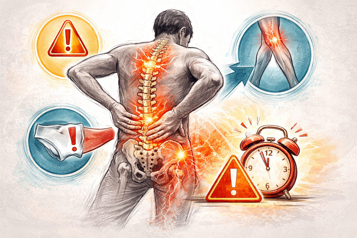 Памятка-бюллетень: когда нужно действовать срочно, а не терпеть. Вы читаете это — значит, вы заботитесь о себе. И это уже сильный шаг. Но есть момент, когда спина «говорит» громче обычного: не ноет, а сигналит. Услышать этот сигнал — не паника, а грамотная безопасность. Пройдите чек-лист. Если отмечаете хотя бы один пункт из блока «СРОЧНО К ВРАЧУ» — вы должныобратиться за медицинской помощью как можно быстрее. Подписывайтесь на канал «Структура и функция» про суставы и позвоночник без мифов ⏱️ СРОЧНО К ВРАЧУ / ВЫЗЫВАЙТЕ НЕОТЛОЖКУ, ЕСЛИ ЕСТЬ: Нарушение мочеиспускания/дефекации (задержка, недержание).