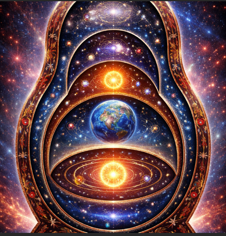 Он рисует это как русскую матрёшку: человек в центре, вокруг него — вложенные экраны-небеса. Коран подтверждает:
