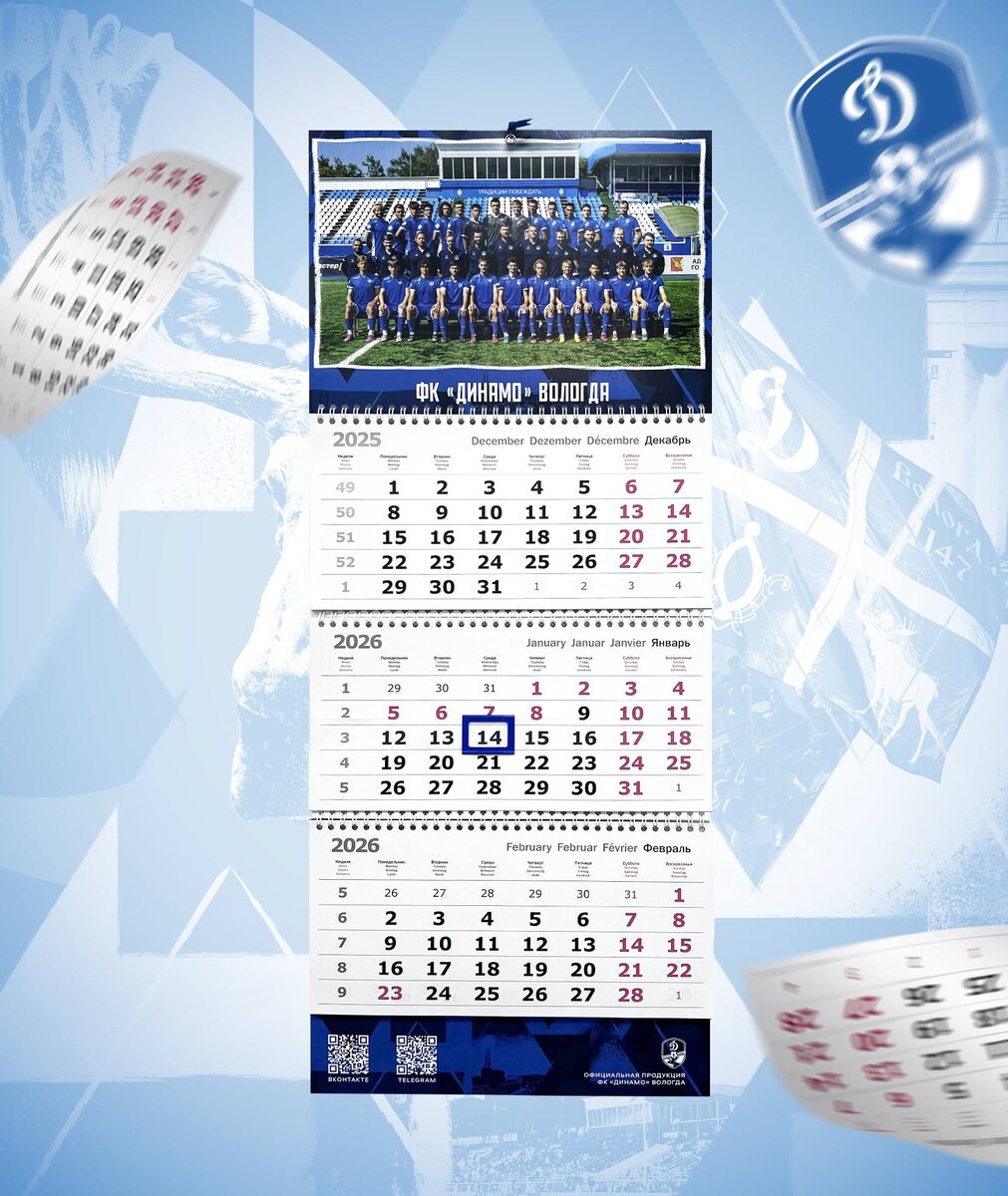 ! Начните новый год вместе с любимым клубом. Календарь «Динамо» Вологда — это не просто удобный помощник на каждый день, но и стильный аксессуар для рабочего стола или офиса, который будет напоминать о футболе круглый год. В продаже представлены блочные календари в двух вариантах. Первый — с командой ФК «Динамо» Вологда, а второй — специальный выпуск, посвящённый предстоящему столетию клуба. Оба календаря выполнены в удобном формате, идеально подходят как для дома, так и для рабочего пространства, и станут отличным подарком для каждого болельщика. Цена календаря — 800 рублей. Приобрести календарь можно на стадионе «Динамо», а также ВКонтакте — через раздел в «Атрибутика». Доступна доставка по всей России. Количество календарей ограничено, поэтому не откладывайте покупку. Отличный подарок для болельщика и стильный акцент в рабочем пространстве — уже сегодня. @dynamovologda