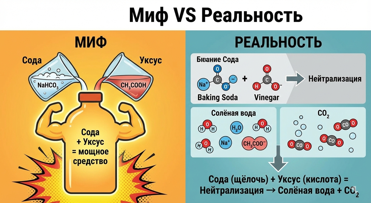 "Сода + уксус = мощное средство 2 в 1!" — На деле: щелочь (сода) + кислота (уксус) = нейтрализация друг друга. Получается солёная вода + углекислый газ (пузырьки). Сода и уксус взаимно нейтрализуются, теряя чистящие свойства.