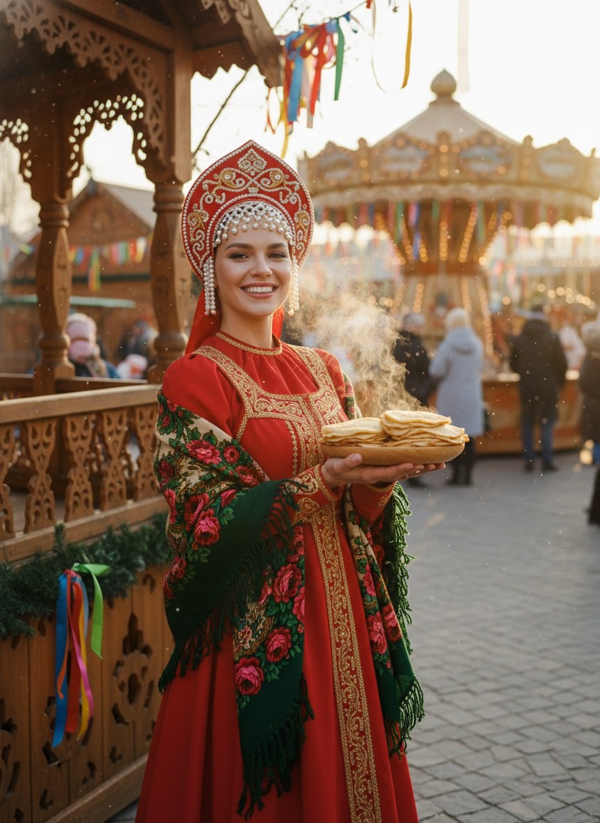 🔥 Сочные краски, золотистые блины и дух настоящего русского праздника. Закидываем селфи в бот и превращаемся в героиню сказки на оживлённой ярмарке. Идеально, чтобы проводить зиму ярко. ⚡️ 🤖 @SnapToVideo_bot Используя загруженное селфи как точный эталон лица (--face_fidelity 1.0), создай фото по описанию с полным сохранением всех черт и 100% сходством. Кинематографичный [праздничный портрет] женщины на [оживлённой ярмарке Масленицы]. Она [стоит у резного терема, улыбается], одета в [традиционный ярко-красный сарафан с золотой вышивкой, кокошник с жемчугом и тёплую шаль с цветочным принтом на плечах]. В руках [тарелка с горячими золотистыми блинами]. Фон: [ярмарочная площадь, деревянная карусель, яркие ленты, берёзовые ветви]. [Тёплый золотистый свет заката], смешанный с атмосферой фестиваля. [Пар от блинов, пылинки в лучах света]. Видимые поры кожи, текстура шерстяного платка и вышивки. Насыщенные цвета: алый, золотой, лесной зелёный. 85мм, f/1.8, Kodak Portra. Как менять: 👀 🎯