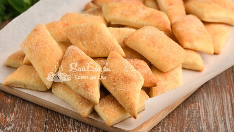 4 варианта. А еще это быстрое тесто можно готовить на растительном или сливочном масле. Из небольшого количества простых продуктов получается целая гора печений или рогаликов. Готовятся они легко и выпекаются быстро. Вся выпечка пористая, очень нежная с прекрасным ароматом и вкусом. Форму тесту можно придавать любую. Вкусно и просто готовить! 1. Тесто на кефире и растительном масле (печенье). В миске взбиваем венчиком одно куриное яйцо (СО) с сахаром (1 ст. л.) и солью (1 щепотка). Яйцо и кефир не нагреваем, берем прямо из холодильника. Вливаем кефир (100 мл 2,5%), растительное масло (50 мл) и еще раз хорошо взбиваем. Муку (250 г, высший сорт) перемешиваем с разрыхлителем (1 ч. л.) и добавляем порциями. Тесто замешиваем сначала ложкой, а потом рукой. Тесто получается мягким и оно почти не липнет к руке. Оставляем на столе на 10 минут. В тесто можно добавить ванилин или корицу. Поверхность присыпаем мукой (немного), тесто раскатываем не очень тонко. Посыпаем сахаром (1 ст. л.) и еще раз