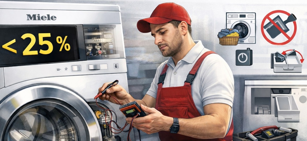 Современные стиральные машины и стирально-сушильные автоматы Miele оснащены системой индикации загрузки, которая помогает оптимизировать расход воды, электроэнергии и времени. Иногда пользователи замечают, что на дисплее отображается значение Современные стиральные машины и стирально-сушильные автоматы Miele оснащены системой индикации загрузки, которая помогает оптимизировать расход воды, электроэнергии и времени. Иногда пользователи замечают, что на дисплее отображается значение < 25 % — как при пустом, так и при полном барабане. Р... (читать дальше: https://mieleremont.ru/soobschenie-zagruzka-25-load-25-na-displee-stiralnoy-mashiny-miele/)
