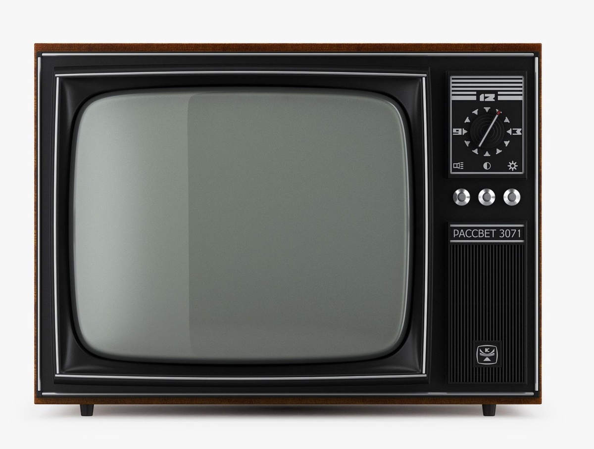 - Спереди размещены ручка переключения метровых каналов, регулятор громкости, совмещённый с выключателем, ручки контраста и яркости, решётка динамика.